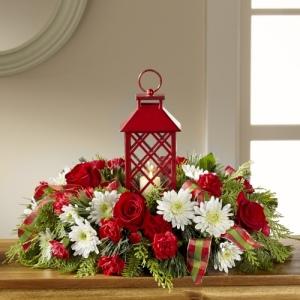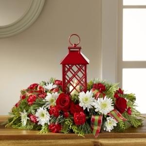 A stylish way to deck your halls this holiday season, this stunning centerpiece offers Christmas beauty to help you gather your loved ones together during this treasured time. Red roses, carnations, and mini carnations are beautifully arranged amongst white chrysanthemums, and an assortment of holiday greens all surrounding an attractive red lantern with a lattice pattern housing a single white votive candle. A great gift for friends and family, but also an wonderful way to decorate your own holiday table!