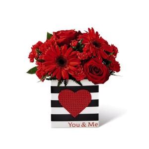 Bring on the red this Valentine's Day and celebrate in style with this gorgeous flower bouquet! Red roses, carnations, gerbera daisies and mini carnations create a true splash of color arranged beautifully in a striped black and white ceramic vase with a bold sequined red heart on the front and the sentiment, "You & Me," lettered in red at the bottom. Sweetly romantic and blooming with a modern design style your recipient will love to fall for this February 14th!