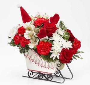 Ride into the season with a joyful burst of holiday blooms! A modern, fresh take on the traditional sleigh arrangement, we bring together red roses, red carnations, and red mini carnations, offset by snowy white Peruvian lilies and chrysanthemums, accented with an assortment of Christmas greens. Presented in a white holiday sleigh. Send holiday cheer in the form of a festive holiday arrangement with an assortment of white and red flowers in a hand–painted sleigh, this holiday flower arrangement is set to send your warmest yuletide wishes to friends and family no matter the distance. Sleigh is approx 9½W x 3 ¾"D x 6 ¼H.