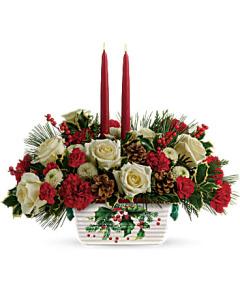 Wish them the happiest of "hollydays" with this elegant centerpiece of roses and winter greens, arranged with glowing taper candles in a hand-painted, oven-to-table stoneware serving dish they'll enjoy for years to come.