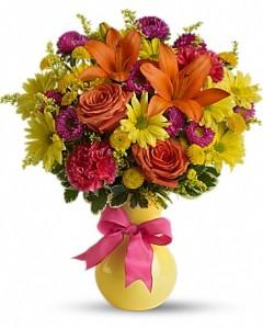 The opulent bouquet includes yellow daisy spray chrysanthemums, pink Matsumoto asters, yellow button spray chrysanthemums, orange roses, solidago, hot pink carnations and orange Asiatic lilies accented with fresh greenery. Delivered in a bright yellow plastic vase tied with a hot pink satin ribbon.