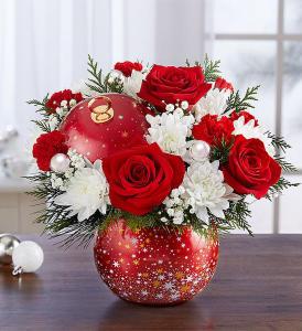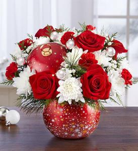 EXCLUSIVE The wonder of a starry night sky comes to life in our new, limited edition holiday arrangement. Joyful red & white blooms are joined by silver ball ornaments, hand-designed inside our keepsake ornament container complete with a matching lid. With its vibrant red finish and display of shimmering stars, this treasured collectible will hold a special place in their heart and home for years to come.